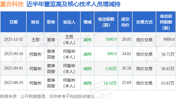 赢合科技近半年内的董监高及核心技术人员增减持详情如下: