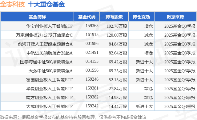 根据2025基金Q3季报公募基金重仓股数据,重仓该股的公募基金共12家,其中持有数量最多的公募基金为华宝基金的华宝创业板人工智能ETF。华宝创业板人工智能ETF目前规模为43.52亿元,最新净值1.1124(1月12日),较上一交易日上涨6.65%,近一年上涨155.61%。该公募基金现任基金经理为陈建华 曹旭辰。陈建华在任的基金产品包括:华宝中证A100ETF联接A,管理时间为2012年12月22日至今,期间收益率为185.99%;华宝化工ETF,管理时间为2021年2月26日至今,期间收益率为-9.45%;华宝中证金融科技主题ETF,管理时间为2021年3月4日至今,期间收益率为77.54%;华宝有色金属ETF,管理时间为2021年3月12日至今,期间收益率为116.26%。曹旭辰在任的基金产品包括:华宝国证通用航空产业ETF,管理时间为2025年5月22日至今,期间收益率为41.11%;华宝中证港股通互联网ETF,管理时间为2025年5月22日至今,期间收益率为2.86%;华宝中证电子50ETF,管理时间为2025年5月22日至今,期间收益率为64.16%。