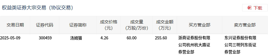 汤姆猫今日大宗交易折价成交60万股,成交额255.6万元
