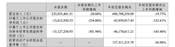 财报显示,今年前三季度,公司实现营收6.97亿元,同比下降19.77%;归母净亏损4393.98万元,同比下滑152.61%,上年同期为8351.26万元,由盈转亏;扣非归母净亏损4617.06万元,同比下滑165.46%。