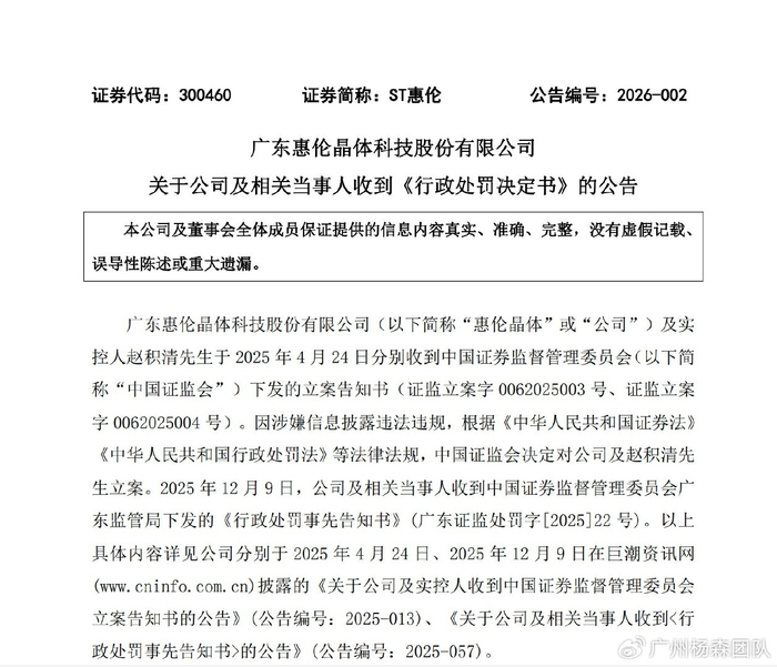 2026年1月12日,广东惠伦晶体科技股份有限公司(惠伦晶体或公司)披露,收到广东监管局出具的《行政处罚决定书》。