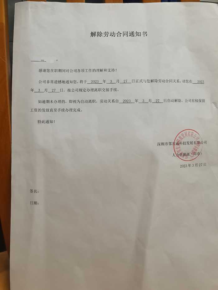 据了解,收到轮休待岗通知书的员工有11位,主要是丹芽科技和艾斯龙的员工,而有4位邻友通的员工收到的是停工待岗通知,停工待岗的时间是6个月,工资是深圳市最低工资标准的80%。