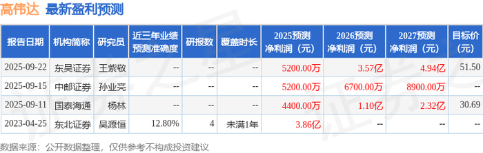 证券之星数据中心根据近三年发布的研报数据计算,东北证券吴源恒研究员团队对该股研究较为深入,近三年预测准确度均值为12.8%,其预测2025年度归属净利润为盈利3.86亿,根据现价换算的预测PE为27.07。