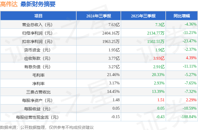 据证券之星公开数据整理,近期高伟达(300465)发布2025年三季报。截至本报告期末,公司营业总收入7.3亿元,同比下降4.36%,归母净利润2134.77万元,同比下降11.21%。按单季度数据看,第三季度营业总收入2.09亿元,同比下降18.37%,第三季度归母净利润752.14万元,同比下降51.22%。本报告期高伟达公司应收账款体量较大,当期应收账款占最新年报归母净利润比达1254.01%。