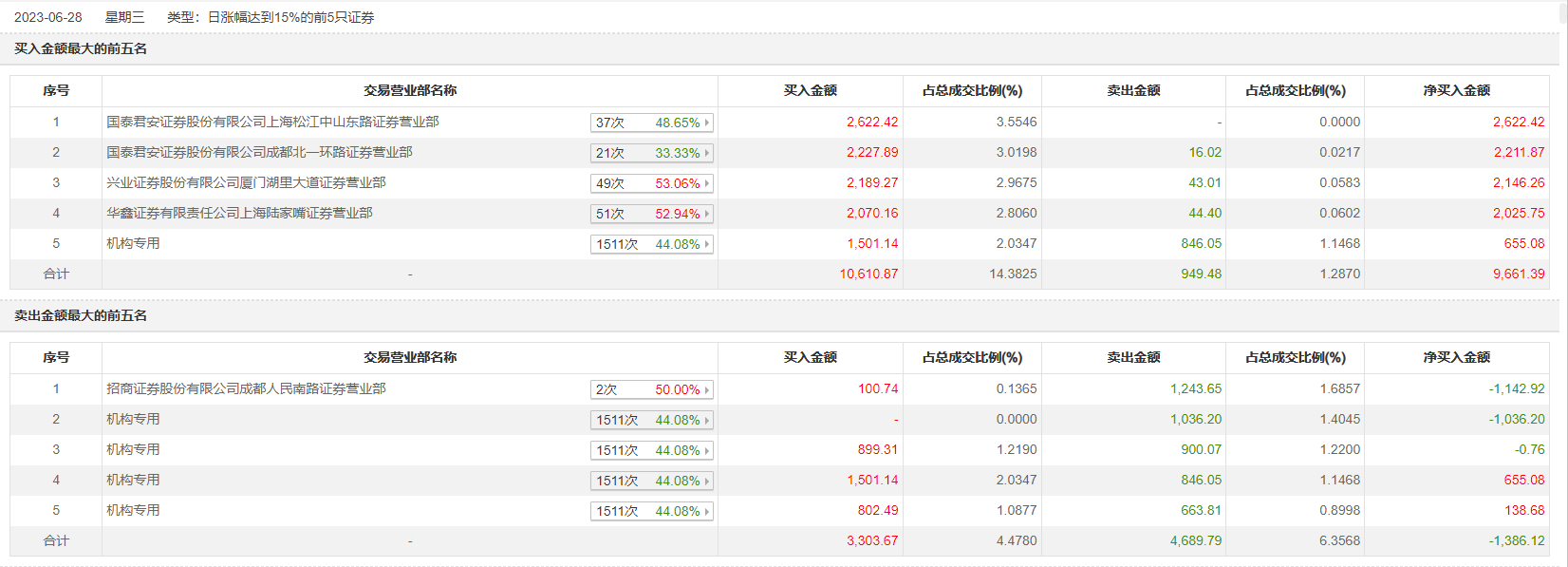 具体来看,机构买入3202.93万元,卖出3446.13万元,合计净卖出243.2万元。此外,国泰君安证券上海松江中山东路证券营业部、国泰君安证券成都北一环路证券营业部分别买入2622.42万元、2227.89万元;招商证券成都人民南路证券营业部、华鑫证券上海陆家嘴证券营业部分别卖出1243.65万元、44.40万元。