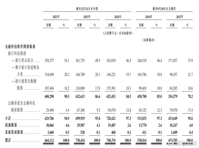 从利润率来看,金融科技软件开发服务的过往毛利率在30%-34%,2025年前三季度增至40.6%,此外咨询服务、系统集成服务毛利率增至28.5%、75.8%。