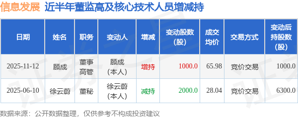 信息发展近半年内的董监高及核心技术人员增减持详情如下: