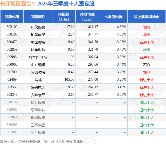 长江旭日混合A的前十大重仓股如下: