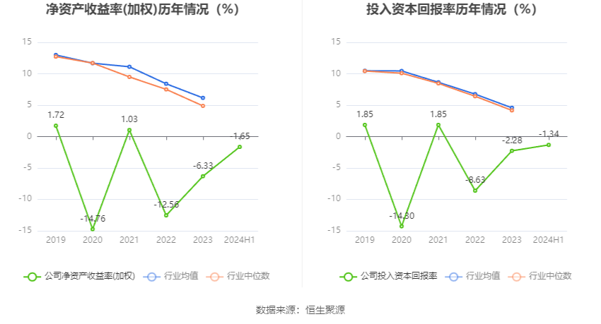 数据显示,2024年上半年公司加权平均净资产收益率为-1.65%,较上年同期下降2.22个百分点;公司2024年上半年投入资本回报率为-1.34%,较上年同期下降2.39个百分点。
