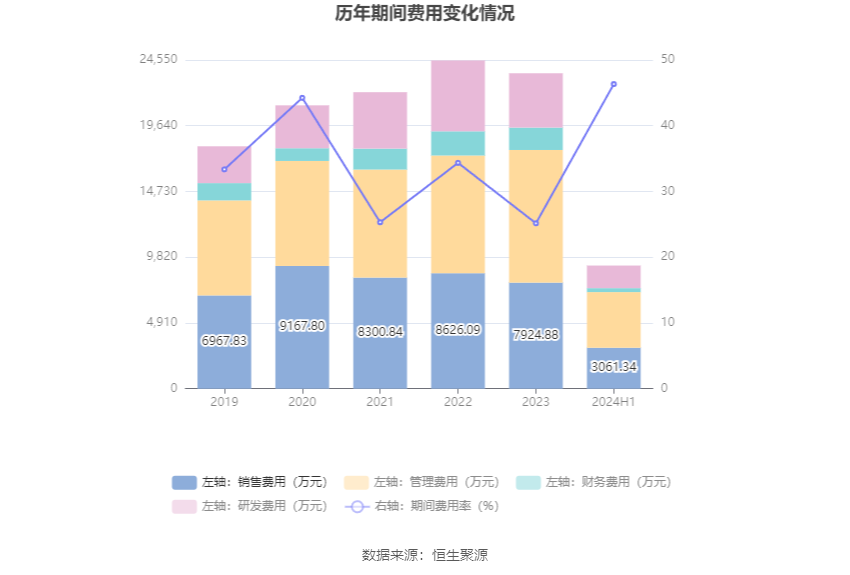 2024年上半年,公司期间费用为9198.66万元,较上年同期增加53.53万元;期间费用率为46.34%,较上年同期上升25.01个百分点。其中,销售费用同比增长8.47%,管理费用同比增长10.82%,研发费用同比增长0.55%,财务费用同比下降67.1%。