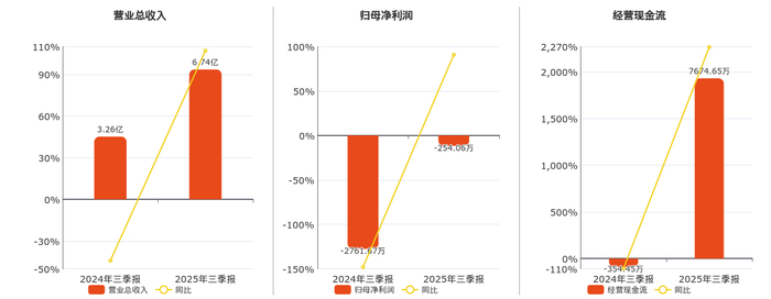 公司营业总收入为6.74亿元。归母净利润为-254.06万元。经营活动现金净流入为7674.65万元。