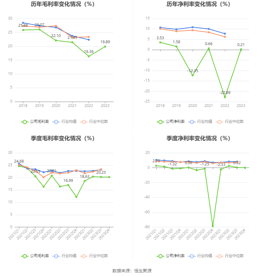 2023年,公司毛利率为19.89%,同比上升3.53个百分点;净利率为0.21%,较上年同期上升23.10个百分点。从单季度指标来看,2023年第四季度公司毛利率为20.23%,同比上升8.06个百分点,环比下降0.02个百分点;净利率为0.09%,较上年同期上升78.94个百分点,较上一季度下降0.23个百分点。