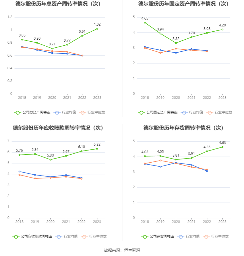 营运能力方面,2023年,公司公司总资产周转率为1.02次,上年同期为0.91次(2022年行业平均值为0.60次,公司位居同行业6/50);固定资产周转率为4.20次,上年同期为3.98次(2022年行业平均值为2.82次,公司位居同行业11/50);公司应收账款周转率、存货周转率分别为6.32次、4.63次。
