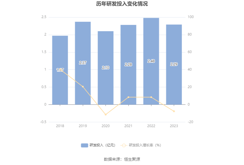2023年全年,公司研发投入金额为2.29亿元,同比下降7.65%;研发投入占营业收入比例为5.32%,相比上年同期下降0.82个百分点。此外,公司全年研发投入资本化率为19.11%。