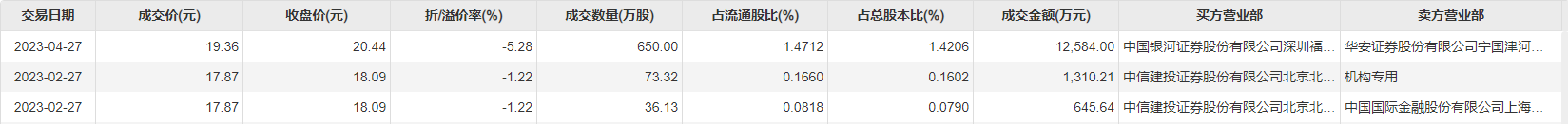 4月27日大宗交易成交650万股,成交额1.26亿元,占当日总成交额的68.53%,成交价19.36元,较市场收盘价20.44元折价5.28%。