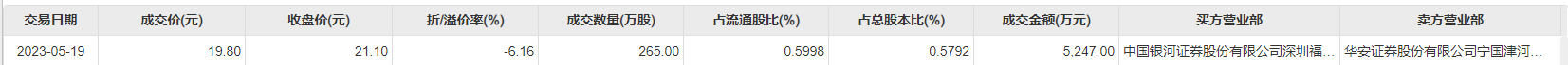 5月19日大宗交易成交265万股,成交额5247万元,占当日总成交额的23.69%,成交价19.8元,较市场收盘价21.1元折价6.16%。