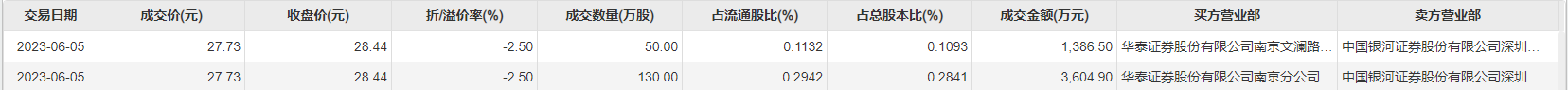6月5日大宗交易成交180万股,成交额4991.4万元,占当日总成交额的8.66%,成交价27.73元,较市场收盘价28.44元折价2.5%。