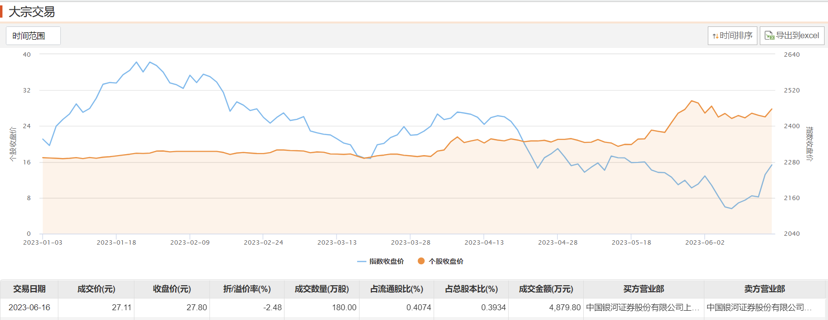 今日大宗交易成交180万股,成交额4879.8万元,占当日总成交额的8.04%,成交价27.11元,较市场收盘价折价2.48%。