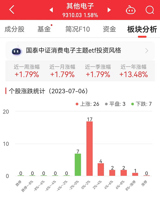 数据显示,截至今日,其他电子板块近一周涨幅1.79%,近一月涨幅1.79%,近一季涨幅1.79%。