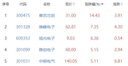 其中,香农芯创、维峰电子、旭光电子、雅创电子、中熔电气位列板块涨幅前五位,涨幅分别为14.43%、7.35%、6.36%、5.15%、5.11%。