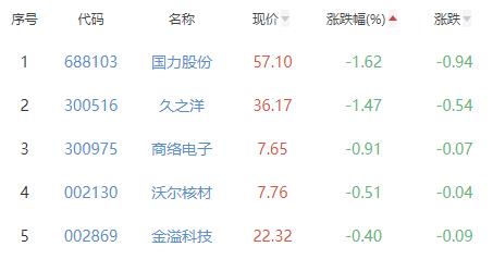 国力股份、久之洋、商络电子、沃尔核材、金溢科技位列涨幅榜后五位,涨幅分别为-1.62%、-1.47%、-0.91%、-0.51%、-0.40%。