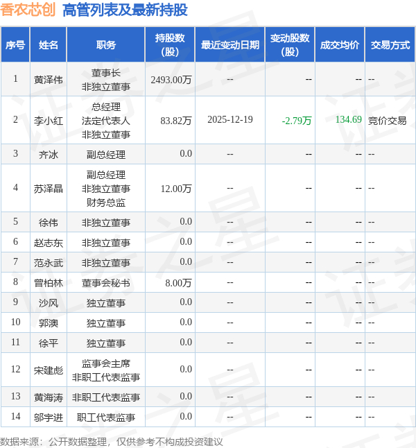 香农芯创的高管列表及最新持股情况如下: