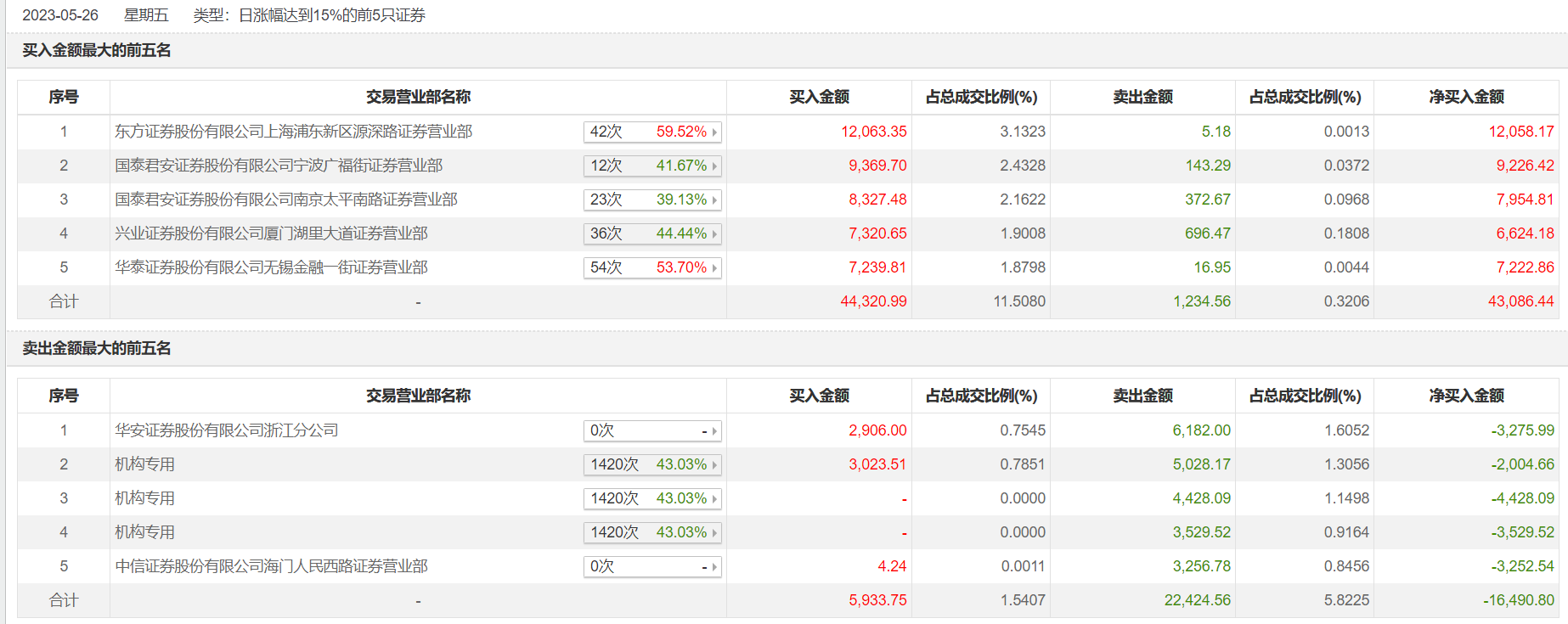 具体来看,机构买入3023.51万元,卖出1.3亿元,合计净卖出9962.27万元。此外,知名游资现身龙虎榜,作手新一(国泰君安证券股份有限公司南京太平南路证券营业部)净买入7954.81万元。此外,东方证券上海浦东新区源深路证券营业部、国泰君安证券宁波广福街证券营业部分别买入1.21亿元、9369.70万元;华安证券浙江分公司、中信证券海门人民西路证券营业部分别卖出6182.00万元、3256.78万元。