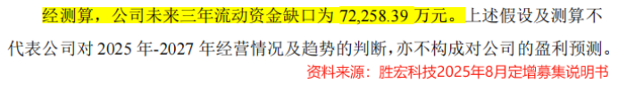 定增募集说明书显示,公司未来三年流动资金缺口为7.2亿元。