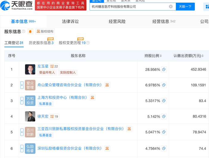 天眼查App信息显示,糖吉医疗成立于2016年8月,位于浙江省杭州市。目前,该公司的注册资本为1564.2178万元,法定代表人为左玉星,主要股东包括左玉星、舟山爱众管理咨询合伙企业(有限合伙)等。