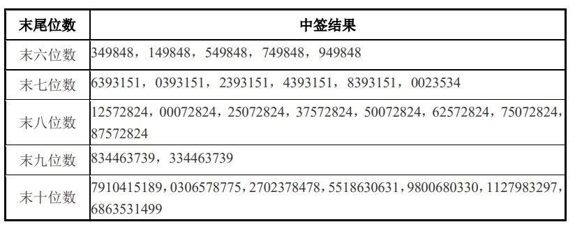 5月9日公告,凡参与光力转债网上申购的投资者持有的申购配号尾数与下图号码相同的,则为中签结果。中签结果共有56808个,每个中签结果只能认购10张(1,000元)光力转债。