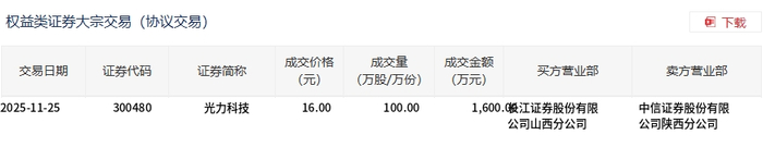 11月25日,光力科技大宗交易成交100万股,成交额1600万元,占当日总成交额的18.14%,成交价16元,较市场收盘价15.74元溢价1.65%。