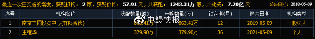 2018年4月21日,万孚生物公告,该公司7.2亿元定增发行完毕,发行价格为57.91元/股,发行数量为1243.3万股。其中,该公司董事长王继华认购379.9万股,合计金额约2.2亿元;南京丰同投资中心(有限合伙)认购863.41万股,合计金额约5亿元。