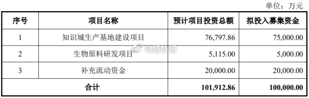 该次向特定对象发行募集资金总额不超过10亿元,扣除发行费用后拟将全部用于以下项目:知识城生产基地建设项目、生物原料研发项目、补充流动资金。