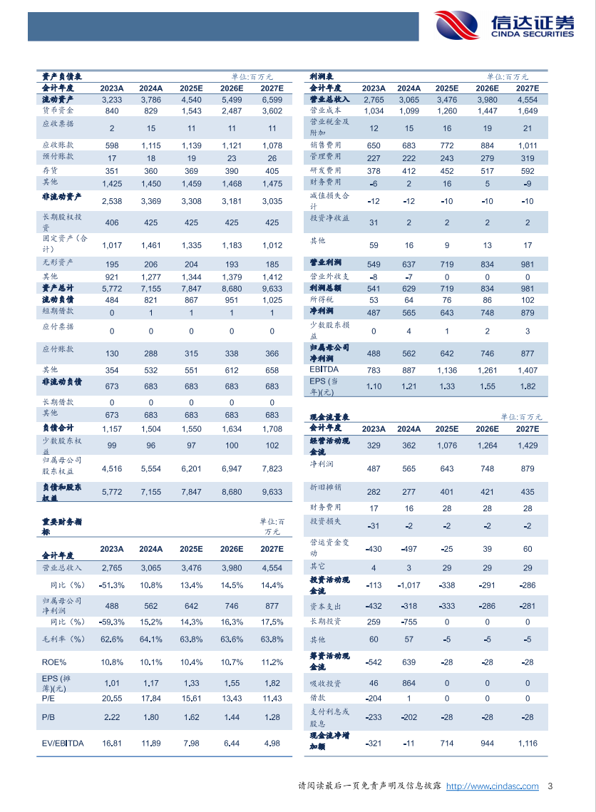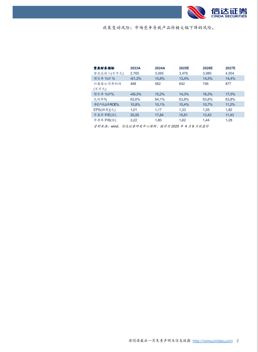 盈利预测:我们预计公司2025-2027年营业收入分别为34.76、39.80、45.54亿元,同比增速分别为13.4%、14.5%、14.4%,实现归母净利润为6.42、7.46、8.77亿元,同比分别增长14.3%、16.3%、17.5%,对应2025年4月9日收盘价,PE分别为16、13、11倍,维持“买入”投资评级。