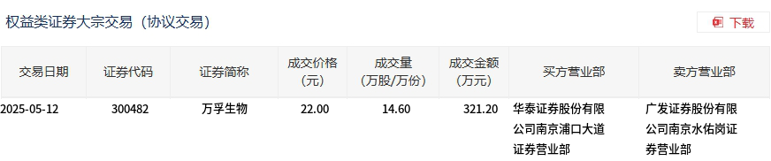万孚生物今日大宗交易溢价成交14.6万股,成交额321.2万元