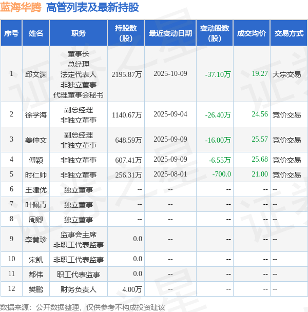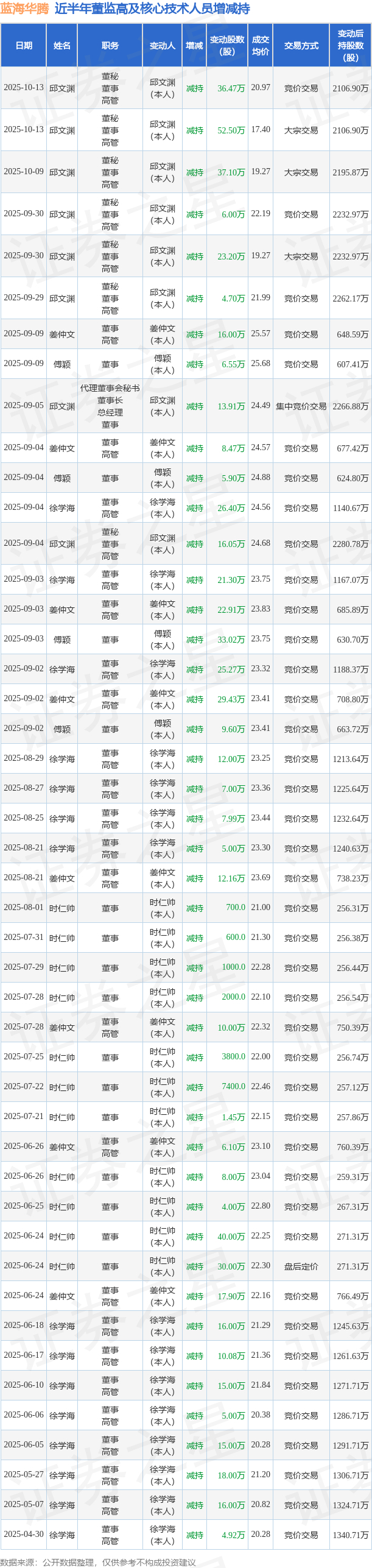 蓝海华腾近半年内的董监高及核心技术人员增减持详情如下: