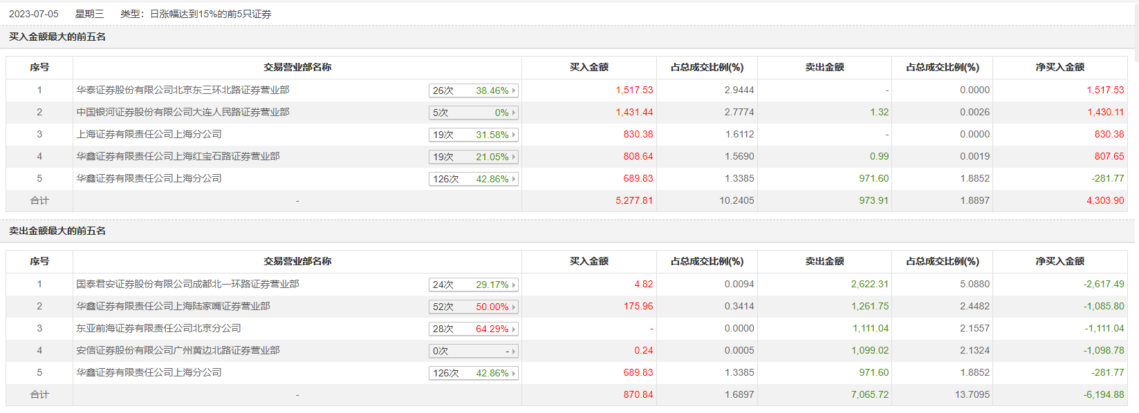 7月5日,光智科技今日涨停,龙虎榜数据显示,上榜营业部席位全天成交1.25亿元,占当日总成交金额比例为24.31%。其中,买入金额为5458.83万元,卖出金额为7068.03万元,合计净卖出1609.21万元。