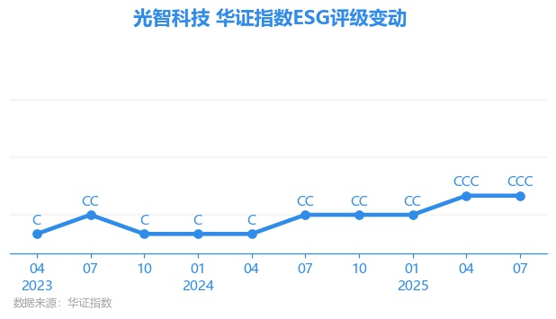 日前,华证指数公布了新一期(2025年7月31日)的ESG评级结果,光智科技(300489.SZ)获得CCC评级(华证指数评级为C起至AAA九档,C为最低档,AAA为其最高一级评级/AA为其第二档),上一期(2025年4月30日)ESG评级为CCC。本期ESG评级在529家电子设备、仪器和元件行业A股上市公司中排名第481(上一期排名第180)。