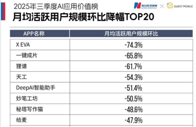 据《每日经济新闻》联合QuestMobile发布的《2025年三季度AI应用价值榜》显示,给麦的月均活跃用户规模出现下滑,环比跌幅达47.9%,这意味着给麦在办公、学习之外的泛娱乐场景中难以留住用户。