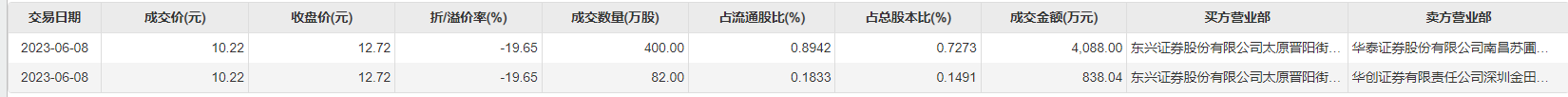 6月8日大宗交易成交482万股,成交额4926.04万元,占当日总成交额的42.87%,成交价10.22元,较市场收盘价12.72元折价19.65%。