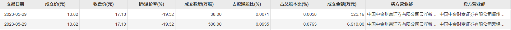 5月29日大宗交易成交538万股,成交额7435.16万元,占当日总成交额的18.87%,成交价13.82元,较市场收盘价17.13元折价19.32%。