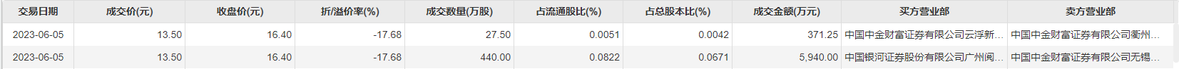 6月5日大宗交易成交467.5万股,成交额6311.25万元,占当日总成交额的8.2%,成交价13.5元,较市场收盘价16.4元折价17.68%。