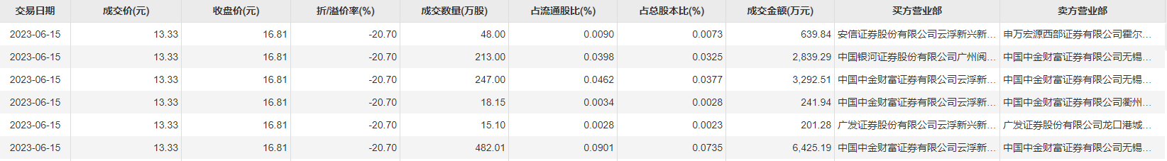 6月15日大宗交易成交1023.26万股,成交额1.36亿元,占当日总成交额的25.8%,成交价13.33元,较市场收盘价16.81元折价20.7%。