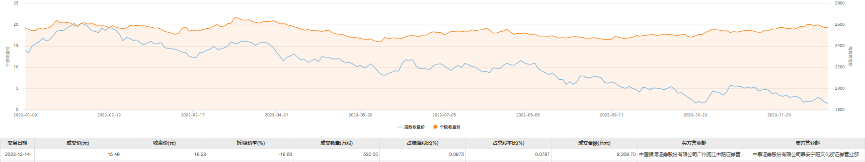 今日大宗交易成交530万股,成交额8209.7万元,占当日总成交额的14.17%,成交价15.49元,较市场收盘价折价19.66%。