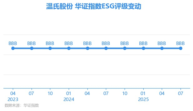 日前,华证指数公布了新一期(2025年7月31日)的ESG评级结果,温氏股份(300498.SZ)获得BBB评级(华证指数评级为C起至AAA九档,C为最低档,AAA为其最高一级评级/AA为其第二档),上一期(2025年4月30日)ESG评级为BBB。本期ESG评级在156家食品行业A股上市公司中排名第18(上一期排名第18)。