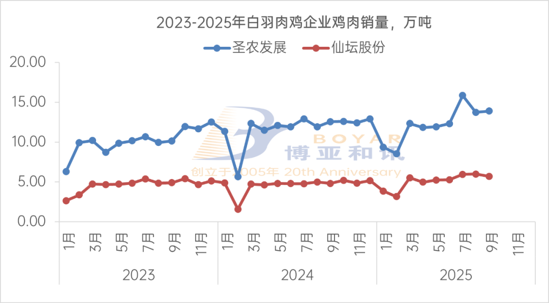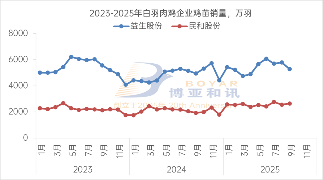 公司益生909小型白羽肉鸡有新批次父母代种鸡开产,商品代鸡苗产量增加,故2025年9月公司益生909小型白羽肉鸡苗销售数量同比和环比都增加。