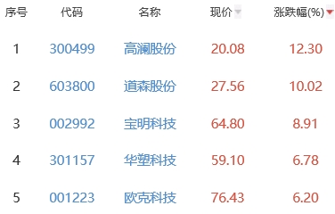 其中,高澜股份、道森股份、宝明科技、华塑科技、欧克科技位列板块涨幅前五位,涨幅分别为12.30%、10.02%、8.91%、6.78%、6.20%。