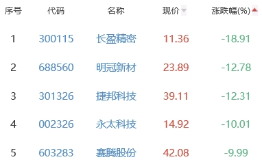 长盈精密、明冠新材、捷邦科技、永太科技、赛腾股份位列涨幅榜后五位,涨幅分别为-18.91%、-12.78%、-12.31%、-10.01%、-9.99%。