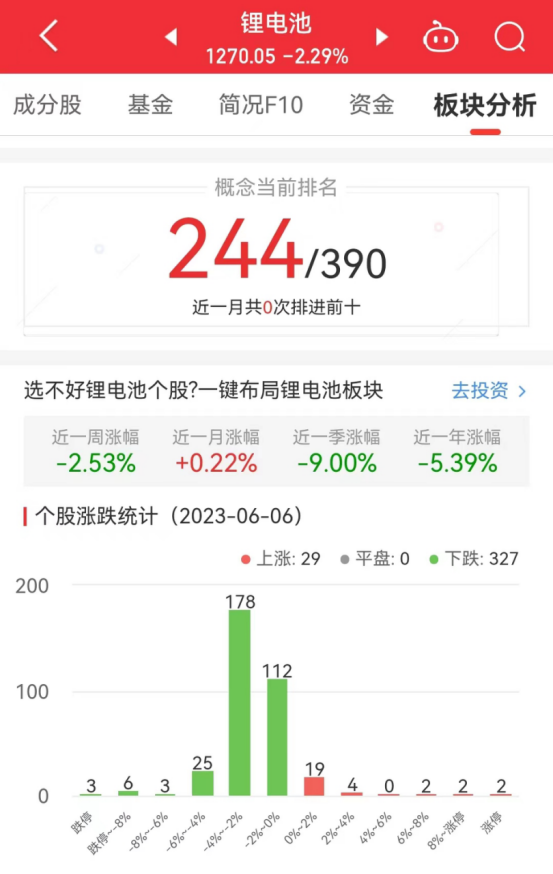中国经济网北京6月6日讯今日,锂电池板块整体跌幅2.29%,其中29只股票上涨,0只股票平盘,327只股票下跌。