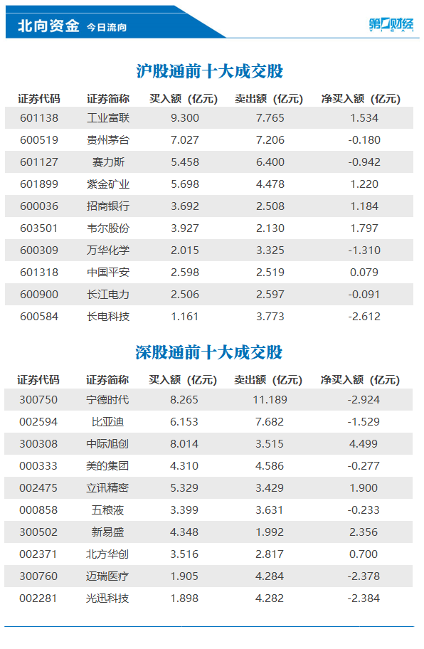 前十大成交股中,净买入额居前三的是中际旭创、新易盛、立讯精密,分别获净买入4.5亿元、2.36亿元、1.9亿元。